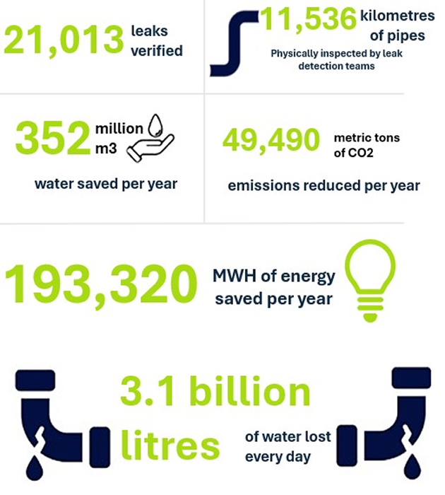 After SUEZ had run satellite imagery leak detection, the number of leaks identified was between 2.5 and 3.5 per crew day – a massive increase from the average 1.3 per day using traditional acoustic methods, and saving around 950 million cubic metres of water since 2017.