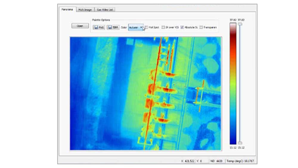 Nuestro sistema se basa en una cámara biespectral LWIR, que permite la captura de información completa, incluyendo el análisis termográfico de las instalaciones para la detección de fallos y optimización de procesos, y la detección de las emisiones fugitivas mediante la grabación de vídeo IR. La georreferenciación de las imágenes y su corregistración con imagen visible, realzan los detalles de la inspección y la identificación precisa de los componentes afectados.