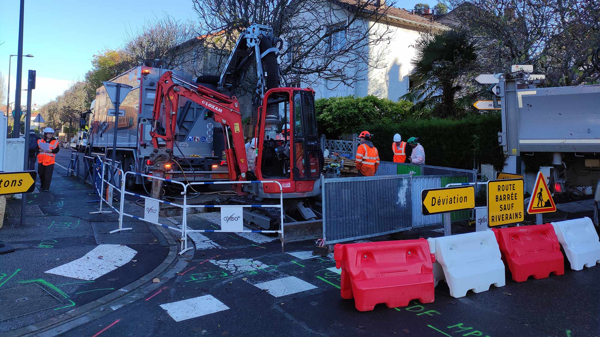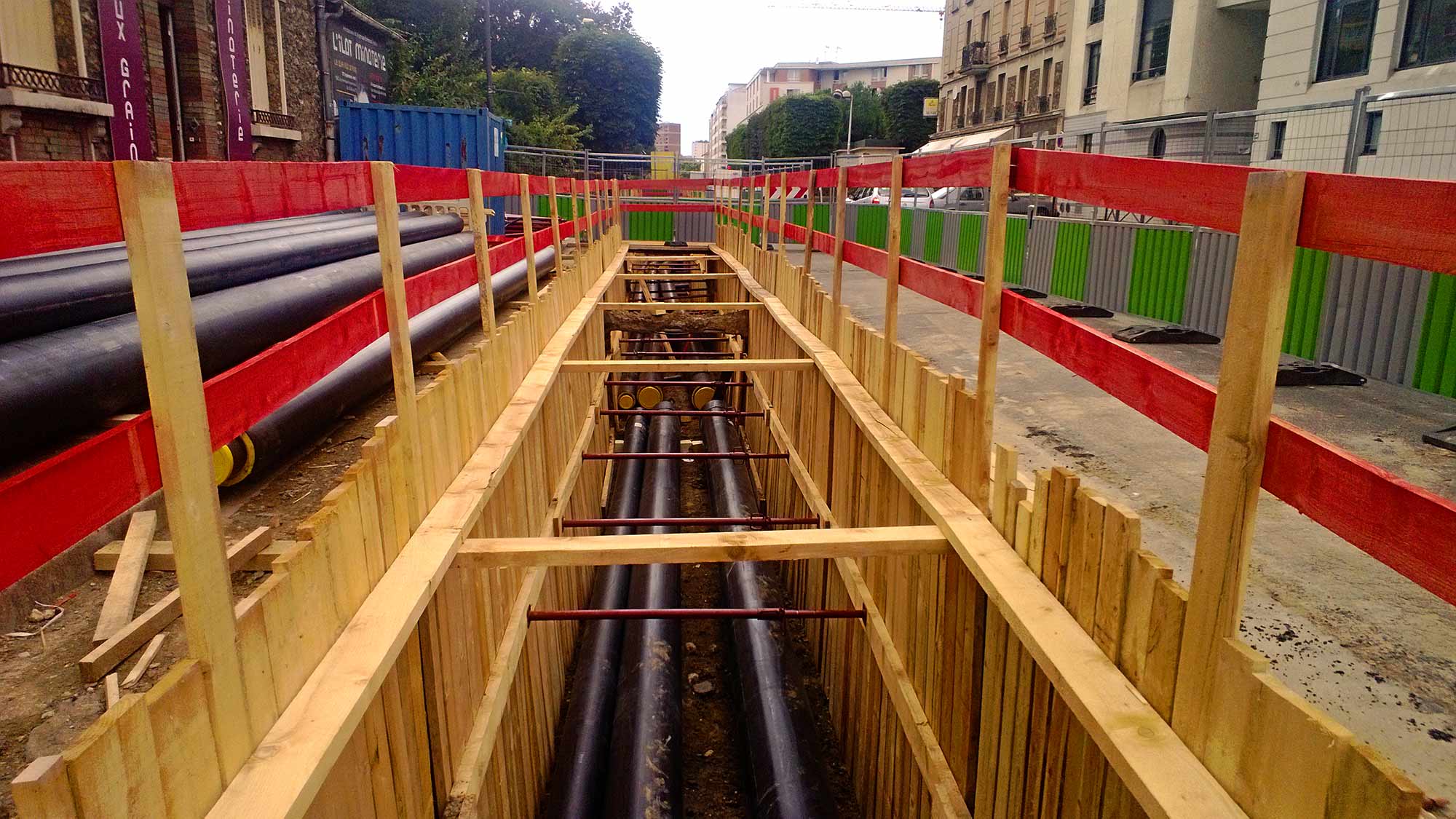 Avant l’excavation, une analyse du sol est réalisée pour repérer les réseaux existants et adapter la technique de pose. Cette phase inclut le marquage du tracé et d’éventuels sondages géotechniques. - Excavation et blindage
