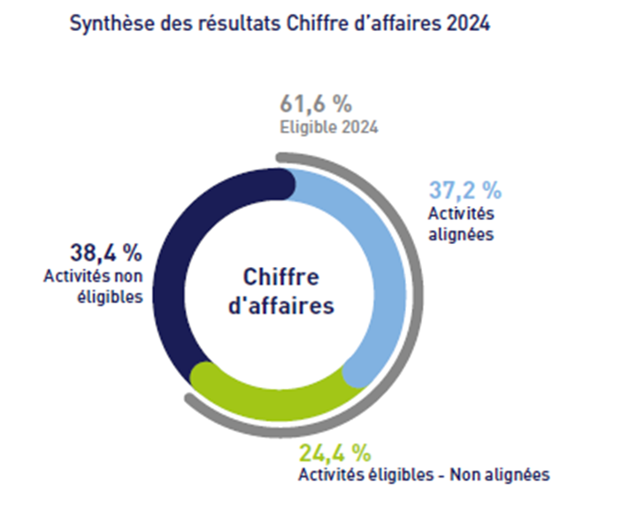 En 2024, 61,6% de notre chiffre d’affaires est éligible à la Taxonomie européenne, dont 37,2% est aligné (stable par rapport à 2023).